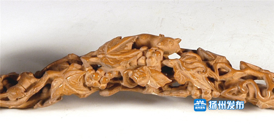 松鼠,自古视为福鼠,有着“金钱鼠”之称,有着富贵、吉祥、喜庆、发财等美好寓意。“松鼠与鼠一样,代表多子。”扬州博物馆保管部相关负责人介绍,馆藏文物中有一件黄杨木雕如意,就使用了松鼠和葡萄的元素,其以略呈弯曲的黄杨木枝杆内心为轴心,在周围用镂透、浮雕的技法雕刻出弯曲缠绕的葡萄藤、累累果实和四只正在偷吃葡萄的小松鼠,活灵活现。“松鼠代表多子,葡萄‘多籽’与‘多子’谐音,所以这二者的搭配很常见,经常关联起来象征福兆。”