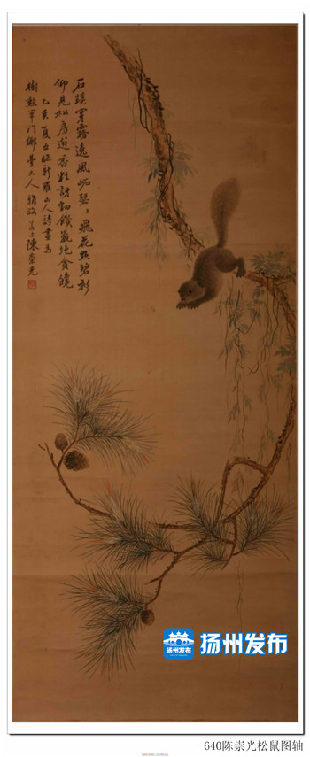 在扬州博物馆馆藏文物中,松鼠形象出现得就比较多了。除了这件木如意,还有一件椰壳雕刻的松鼠松针摆件,一只小松鼠张开大如伞盖的尾巴趴在上面,形象十分讨喜。此外,馆藏书画中也有多件作品中出现松鼠的形象,如清顾海林松鼠图扇叶、清陈崇光松鼠图轴、清李育松鼠竹石图轴、清杨法松鼠图扇叶、清顾伯逵松鼠鱼图扇面等。