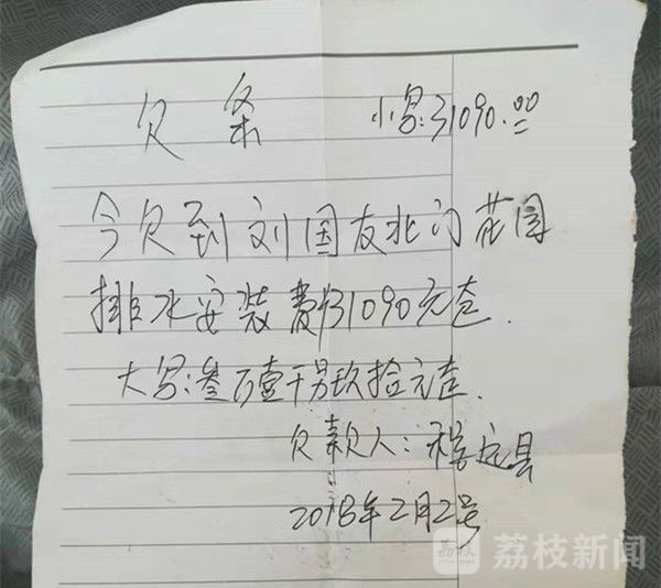 2017年底,北门花苑水电安装工程全部结束,并通过验收。按照此前约定,程远县需要结清剩下的31090元,不料,程远县开始推脱,此后留下一张欠条后就失联了。