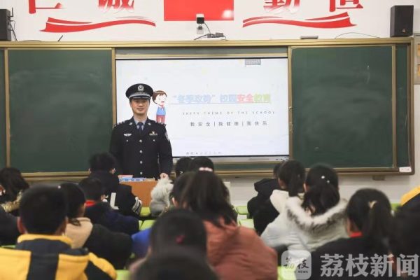 寒假来临,为使孩子们度过一个健康安全的假期。近日,盐都区公安局盐渎派出所开展“冬季攻势”宣传进校园活动,为孩子们送去安全防范知识。