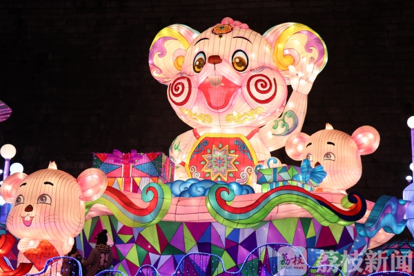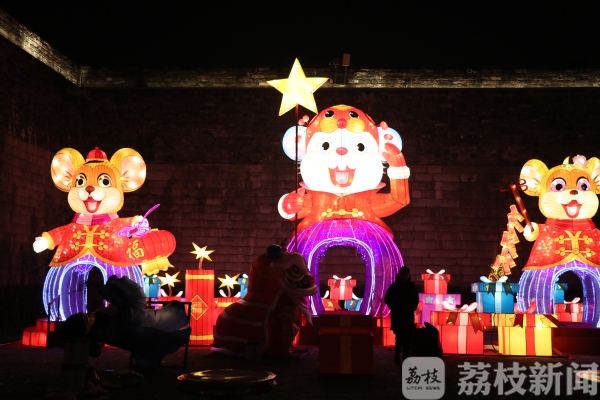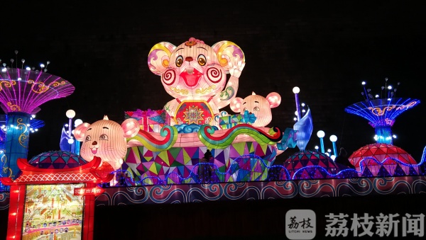 今天(14日)晚上,在南京老门东城墙脚下,一片灯火通明,城墙下一组九米高、12米长的“鼠宝迎春”灯亮了!整个灯彩用五彩绸布制作,“老鼠”惟妙惟肖,滑稽可爱,工艺精细,把景区装点一新,萌萌的鼠灯吸引了众多游客频频举起手中的相机、手机拍照留念。