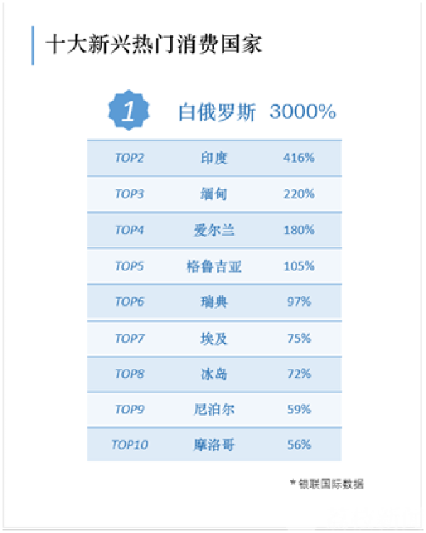 从消费增速来看,十大新兴热门消费国家包括:白俄罗斯、印度、缅甸、爱尔兰、格鲁吉亚、瑞典、埃及、冰岛、尼泊尔、摩洛哥。增速最高的白俄罗斯达到3000%。最低的摩洛哥也有56%。“一带一路”沿线市场消费热度提升尤其明显。