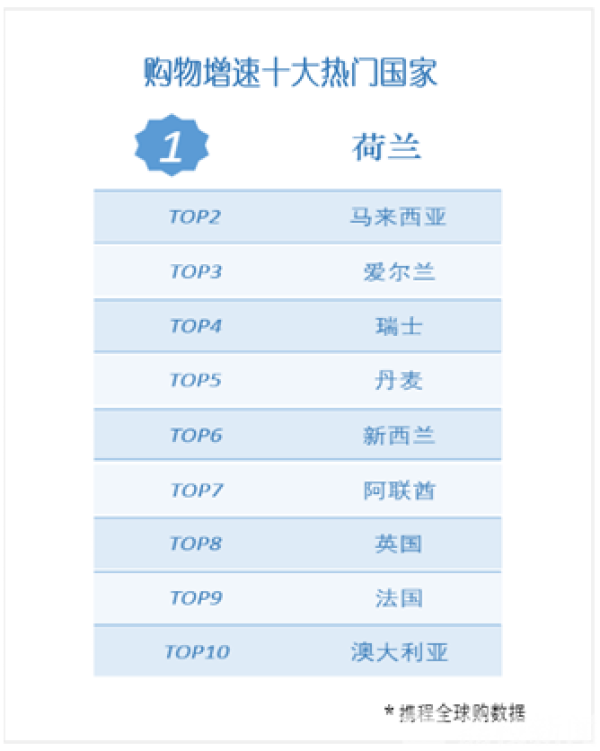 哪些国家中国人购物交易增长最快?10个国家是:荷兰、马来西亚、爱尔兰、瑞士、丹麦、新西兰、阿联酋、英国、法国和澳大利亚。