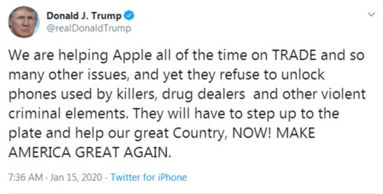 美国总统特朗普刚刚在推特上发文炮轰苹果公司。当地时间14日,特朗普发推文说:“我们一直在贸易和其他许多问题上帮助苹果,但他们(苹果)却拒绝解锁杀人犯、毒贩和暴力犯罪分子们使用的手机。他们现在必须挺身而出,帮助我们这个伟大的国家!”在推文的最后,他又重复了自2016年美国大选就开始使用的口号:“让美国再次伟大。”(MAKE AMERICA GREAT AGAIN. )