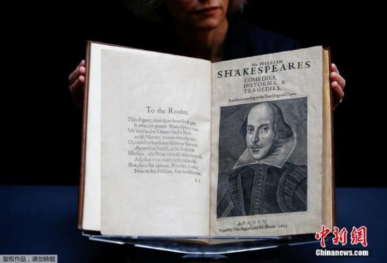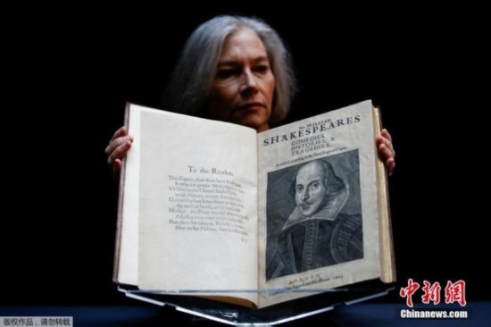 据报道,佳士得拍卖行上周五(10日)宣布,一本首次收录莎翁作品的罕见书籍将于4月在美国纽约拍卖,预计将拍出400万至600万美元。