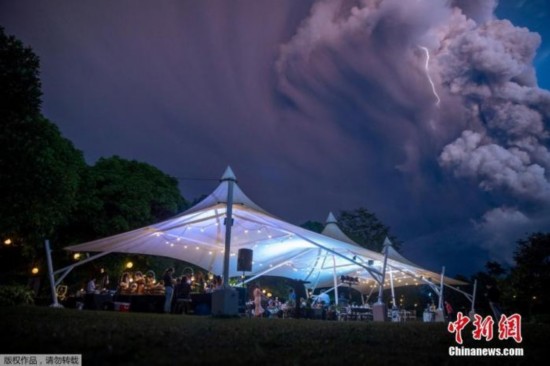 当地时间1月12日,菲律宾卡维特(Cavite)的阿方索,塔尔火山(Taal Volcano),开始剧烈活动,但一对新人仍然举行了婚礼。这对新人的身后,火山喷发出的大量浓烟伴随着闪电弥漫在空气中,场景震撼。