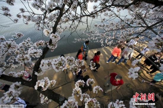 资料图:美国华盛顿潮汐湖畔樱花盛放,吸引游客驻足观赏。