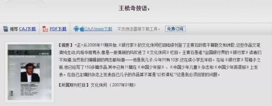 记者检索知网发现,王青石2006年首次在《银行家》发表散文和诗歌时年仅10岁。王松奇还曾在该期刊发表《爸爸的话》,推介儿子新书。