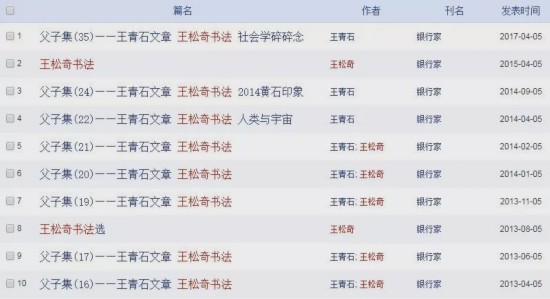 在知网检索发现,王松奇、王青石父子已在《银行家》发表数十篇书法、散文作品。