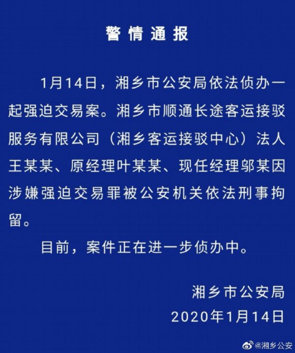 荔枝新闻讯 湖南省湘乡市公安局发布通报,1月14日,湘乡市公安局依法侦办一起强迫交易案。湘乡市顺通长途客运接驳服务有限公司(湘乡客运接驳中心)法人王某某、原经理叶某某、现任经理邬某因涉嫌强迫交易罪被公安机关依法刑事拘留。目前,案件正在进一步侦办中。
