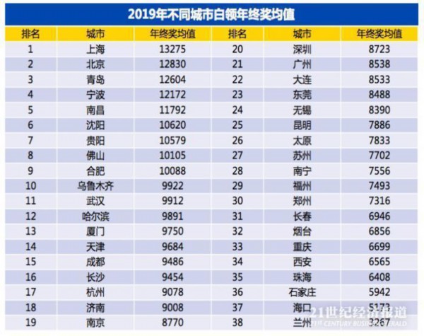 上海以13275元领先全国,是兰州的4倍2019年度年终奖发放最高的城市是上海,上海白领的年终奖平均金额达13275元,包括上海在内,一共有9城市年终奖平均金额过万,其余8个城市分别是:北京(12830元)、青岛(12604元)、宁波(12172元)、南昌(11792元)、沈阳(10620元)、贵阳(10579元)、佛山(10105元)、合肥(10088元),而年终奖平均金额最低的城市是兰州,平均金额仅为3267元,上海白领的年终奖平均金额超过兰州白领的4倍。