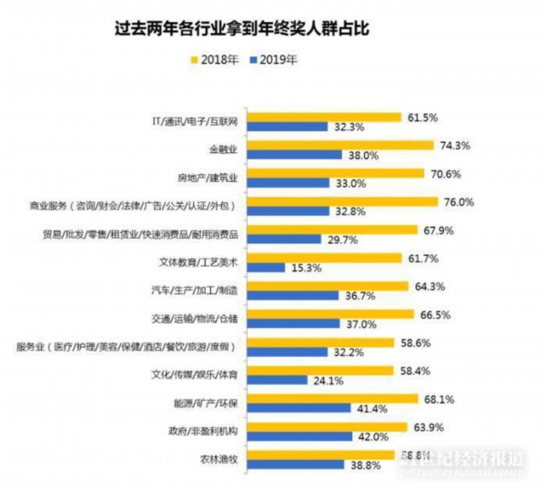 值得注意的是,2018年白领获得年终奖比例最高的商业服务行业今年这一占比也大幅下降,从76.0%跌至32.8%,下降了43.2个百分点。