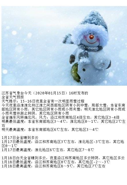 根据最新气象资料分析,15-16日夜里全省有一次明显雨雪过程,今天夜里沿淮淮北和江淮之间西部地区阴有小到中雪,局部大雪,本省东南部地区阴有小雨,其它地区阴有小雨或小雨夹雪;明天淮北地区阴有小雨或小雨夹雪并渐止转阴,其它地区阴有小雨,全省偏东风转偏北风,风力:沿江和苏南地区4级左右,其它地区3-4级,明晨最低温度:本省东南部地区3~4℃,淮北地区0~1℃,其它地区2℃左右,明天最高温度:本省东南部地区6℃左右,其它地区3~4℃。