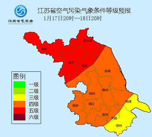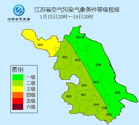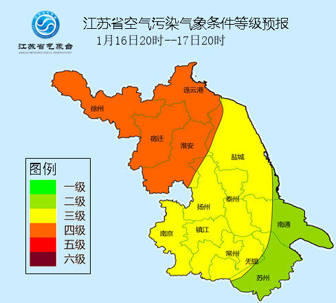 我苏网记者了解到,1月16日江苏空气污染气象等级预报西北部三级,东部沿海地区一级,其它地区二级,1月17日淮北地区四级,江淮之间三级,其它地区二级,1月18日淮北地区五级,江淮之间四级,其它地区三级。