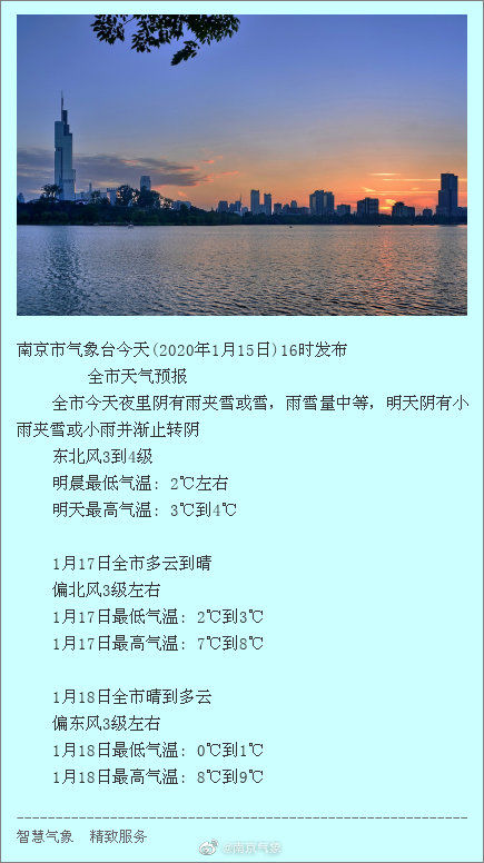 另据南京气象发布,全市今天夜里阴有雨夹雪或雪,雨雪量中等,明天阴有小雨夹雪或小雨并渐止转阴,东北风3到4级。明晨最低气温: 2℃左右,明天最高气温: 3℃到4℃ 。雨雪量达小到中等,局部大雪。最大积雪深度达1到6厘米。