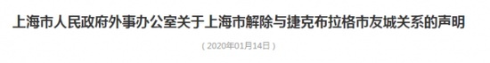 1月14日,上海市人民政府外事办公室发布声明,宣布解除与捷克布拉格市友城关系。