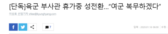 韩国《京乡新闻》16日发布了一则独家新闻:韩国一名正在陆军服兵役的副士官利用休假期间接受变性手术,并拒绝国防部的提前退伍劝告,希望继续作为女兵服役……