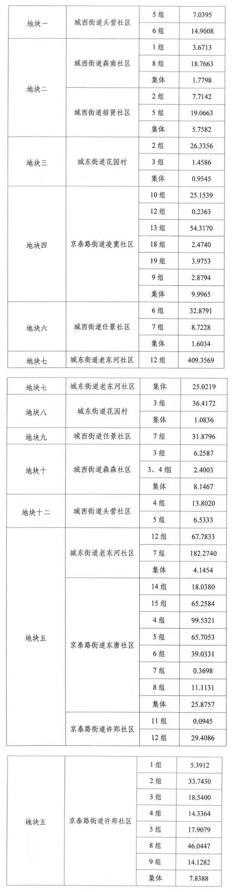 海陵区京泰路街道东唐社区7个组及社区集体土地4.921公顷,城东街道花园村2个组及村集体土地2.0975公顷,城东街道老东河社区2个组及社区集体土地7.6032公顷,京泰路街道凌窦社区6个组及社区集体土地3.3085公顷,城西街道任景社区2个组及社区集体土地2.245公顷,城西街道森南社区2个组及社区集体土地0.7615公顷,城西街道森森社区2个组及社区集体土地0.5255公顷,城西街道头营社区3个组土地1.2908公顷,京泰路街道许郑社区9个组及社区集体土地3.0351公顷,城西街道招贤社区2个组及社区集体土地1.003公顷。