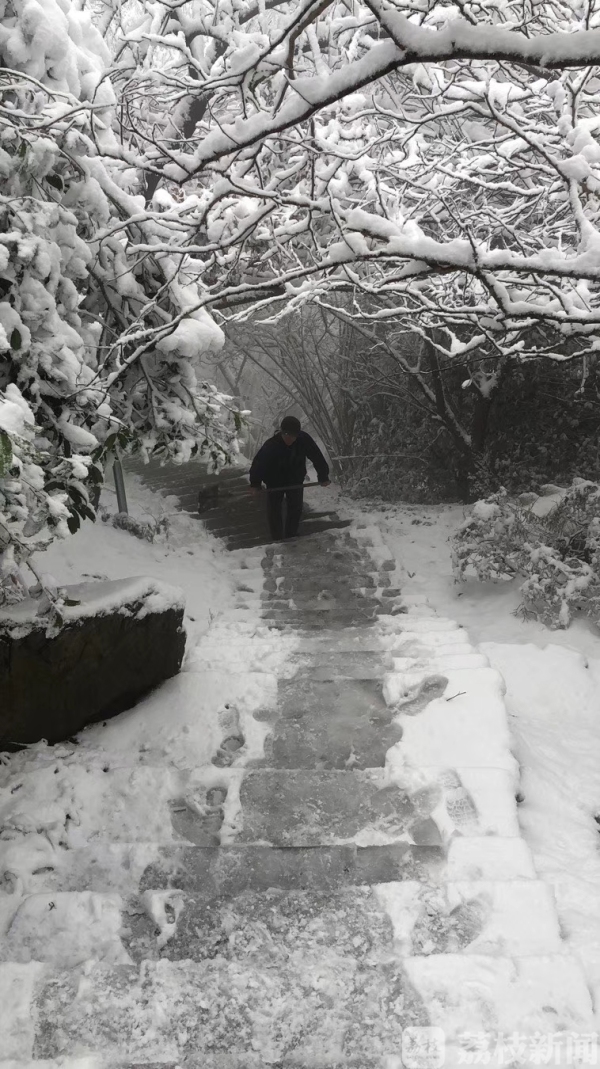 看见有人登山,正在扫雪的工作人员还不忘提醒一句:“慢点爬山!山路湿滑注意安全 ”。