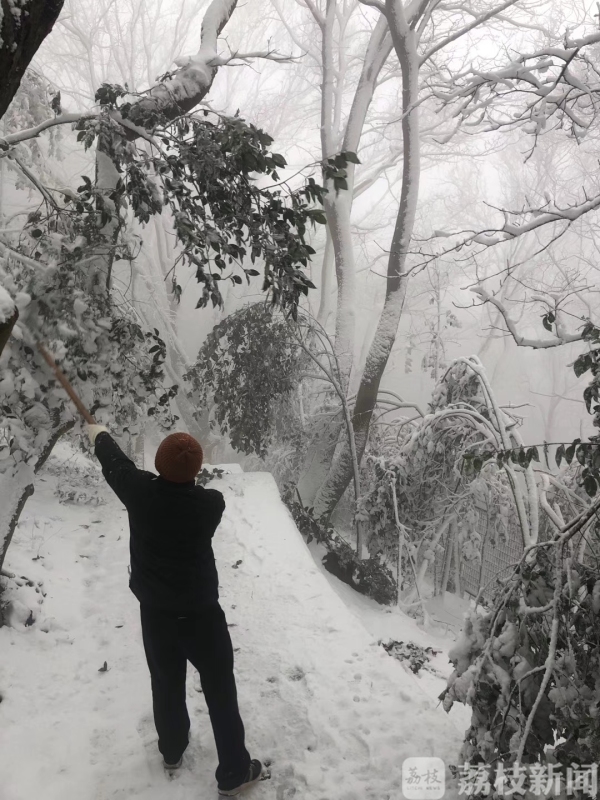 除了打扫石阶上的雪,看见路边大树被大雪压弯了,他们也会及时清除,“雪太重会把大树压断,对登山的人来说,也是安全隐患。”