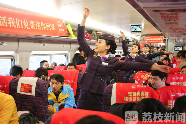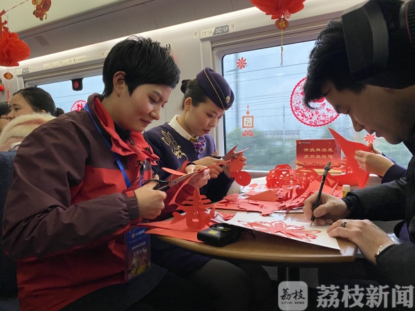 当日,G7164次、G9294次列车上,乘务人员为务工团体旅客发放春联、剪纸,表演丰富多彩的文艺节目。G7164次列车乘务人员表演了黄梅戏《一月思念》《夫妻双双把家还》等传统优秀戏曲经典唱段,为他们送去浓浓的年味,欢声笑语洒满了车厢。