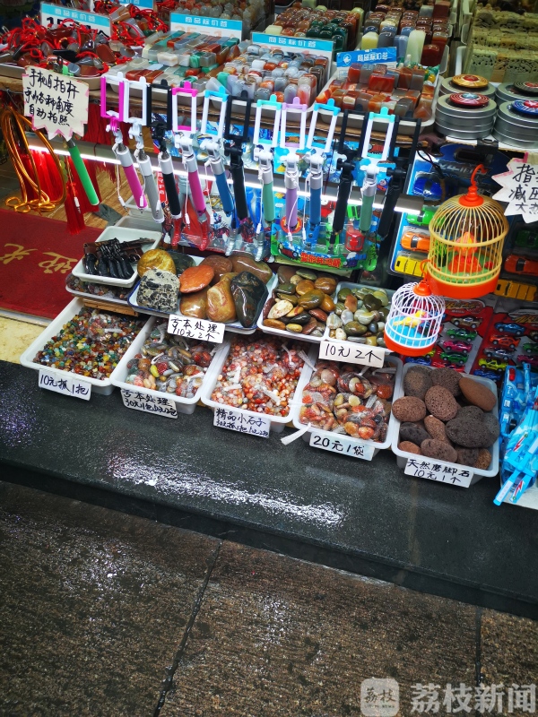 除了食品安全,诚信消费也是检查的重点。夫子庙景区内售卖雨花石、手链等装饰品的商店居多。在一家玉石门店内记者看到,在入口处摆放了大小不一、五颜六色的石头,标牌上写明雨花石。检查人员表示,真正的雨花石应该是以玛瑙为主要成分的石英质玉石,虽然部分商家没有直接标明石头种类,但如果是假冒产品却以雨花石为名口头推销,消费者一旦发现可以向当地市场监管部门举报。 检查人员要求商家自查自纠,立即撤掉店面内有误导嫌疑的标签标识。