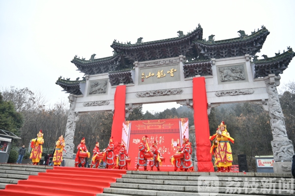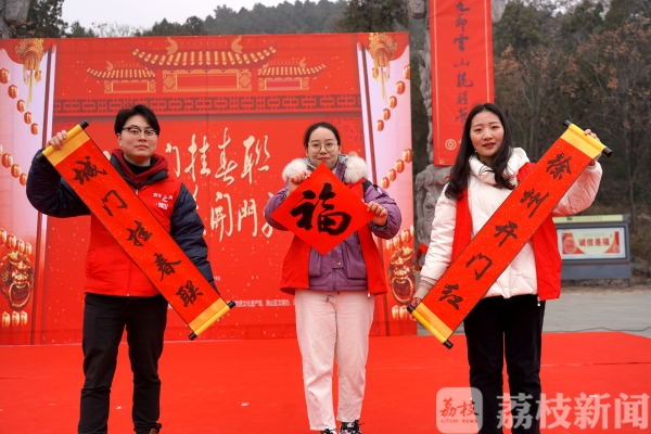 “春色任铺开,十里彭城,九节云山龙醒梦;大风凭唱起,一箫汉韵,千秋气象鹤冲天。”、“云舞晴空,祥和禹甸,旭日一轮中国梦;龙腾盛世,锦绣彭城,春潮万里大风歌。”现场嘉宾拉动红绸,由省书协副主席马亚及省楹联研究会副会长刘云虎书写的西门、北门巨幅春联展现在云龙山脚下。