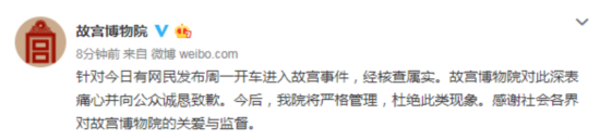 就在今晚(17日),故宫博物院官方微博回应:“针对有网民发布周一开车进入故宫事件,经核查属实。故宫博物院对此深表痛心并向公众诚恳致歉……”