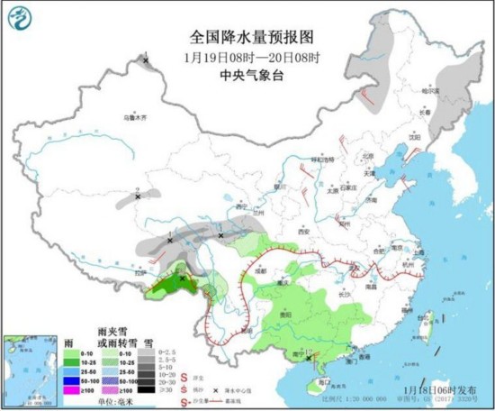 1月19日08时至20日08时,西藏东部、青海南部、川西高原北部、云南西北部、甘肃南部、新疆北疆北部、内蒙古东北部、东北地区东部等地部分地区有小到中雪或雨夹雪。西南地区东部、湖南南部、华南中西部、西藏东南部等地部分地区有小到中雨。陕西北部、内蒙古中东部、河北北部、辽东半岛、山东半岛、河南中部等地部分地区有4~5级风。