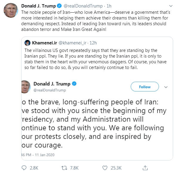 接着,他用英语和波斯语两种语言转发哈梅内伊此前的一条推特,不无拱火地说道:“那些爱美国、品行高尚的伊朗人民,理应有一个更注重帮他们实现梦想、而不是因为要求尊重而杀了他们的政府。”“与其让伊朗走向毁灭,伊朗领导人应该摒弃恐怖主义,让伊朗再次伟大!”特朗普说。