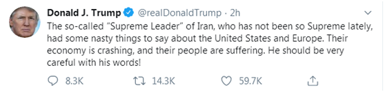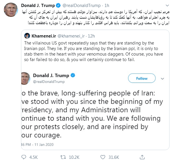 特朗普先后用英语、波斯语两种语言转发哈梅内伊推特,向伊朗展开猛烈攻击。