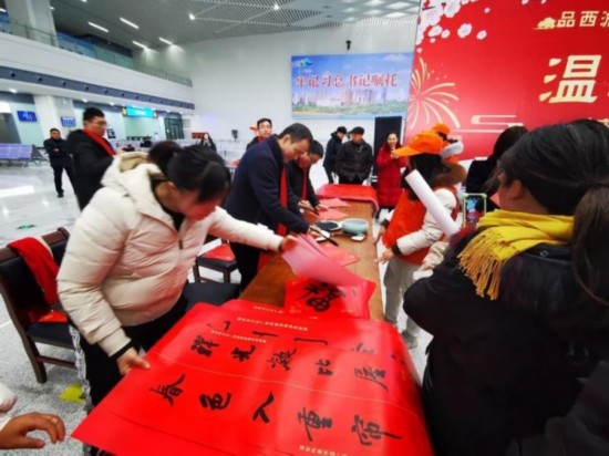 活动现场,来自淮安市美术馆(书画院)的书法家们挥毫泼墨,不一会儿,一张张蘸满祝福的春联、一个个喜庆的“福”字被过往旅客捧在手里,墨香中充满了浓浓的年味!旅客梅先生表示,“收到这个‘福’字,感觉到心里特别的温暖,谢谢他们的祝福。”