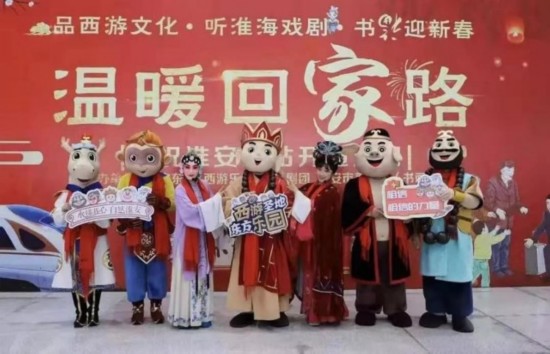 来自淮安西游乐园的工作人员,特意穿上了师徒四人造型的人偶服装亮相,为旅客们送上了新年台历、福袋等小礼物,现场欢快的气氛让远在异乡的游子感受到了浓浓的暖意。“现在有高铁可太方便了,淮安至徐州,从2个半小时汽车行程缩短到1小时高铁行程;淮安至北京,以前坐汽车超过10个小时,现在乘坐高铁只需要4小时17分钟,这是一个时代的见证。”淮安籍旅客安波欣喜地说。