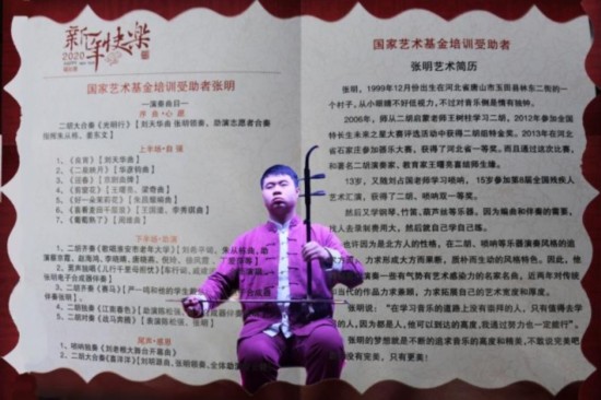 视障音乐青年张明,1999年12月出生在唐山玉田县的一个村庄,患有先天性视障。六、七岁的时候,辗转全国各大眼科医院求医问药也没有任何效果,“放弃治疗,不能放弃培养,不能让他吃闲饭”。于是,果断送到玉田县特教中心上学。在特教中心,被细心的特教老师发现,“有时哭闹中的寄宿生张明,会伴有节奏地敲桌子敲碗,而且对播放的音乐很敏感”。父母告诉老师“张明从小就喜欢唱歌”。为此,特教中心为他安排了音乐老师,强化了唱歌、二胡、钢琴等课的教学。由于学琴进度快,又有一定的音乐天赋和勤学苦练的品质,又得到了当地二胡名师王树柱的赏识,手把手地敎了张明八年二胡。在一次石家庄百花迎春大赛中,又与当时的二胡组评委、全国著名二胡演奏家、教育家王曙亮结缘,并得到真传,无论是二胡的演奏技能和艺术表现力都上了一个台阶。其间,在全国及河北省、市、县的相关青少年才艺大赛中屡屡获奖,玉田县电视台曾在《艺术梦工厂》综艺节目,以“追逐少年艺术梦”为题的个人专场推介张明。去年,张明在全国艺术基金首批特殊人才吉林长春大学音乐学院培训后,在淮安的不愿透露姓名的张明“快手”平台粉丝的热心资助下,11月中旬来到淮安音乐创业。