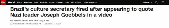 “下一个十年的巴西艺术将是英雄主义的......”当地时间16日,巴西政府文化特别秘书罗伯托·阿尔维姆(Roberto Alvim)在推特上公开发布的一段视频中这样说道。随后,网友发现,这段文字与纳粹宣传部长演讲内容非常雷同,从而引发广泛争议。当地时间17日,巴西总统办公室发表声明称,因发表不当言论,阿尔维姆被正式解雇。