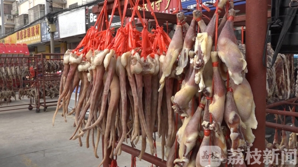 1月18日下午,记者还没踏进步凤镇的街头,远远的就闻到一股腌制咸猪头飘出来的香味,走进小街,只见街道两侧的商户门前,钢铁支架上挂满了腌制好的咸猪头、咸鱼、咸鸡,各家商户都称自己是正宗的步凤咸猪头,让人眼花缭乱,在街头一家标为徐记咸猪头的门市前,摆出了十几个铁架子,上面挂满了腌制好的咸猪头、咸鸡、咸鸭和咸鹅,店主徐鑫帅告诉记者,他们家做这个腌制咸猪头已经有三十多年的历史了,在他还没出生之前就开始做了,今年的销量还不错,有几万只猪头,现在主要经营咸猪头、咸野兔、咸鱼咸鸡鸭,排骨、香肠,这些都是常年供应的。在步凤街西首开门市的张一鹏告诉记者,他是做电商的,今年因为受到非洲猪瘟的影响,猪头价格大幅度上涨,是去年价格的两倍,但尽管这样,在今年节前的销售高峰期,每天也可以朝外发货达五、六百只猪头。