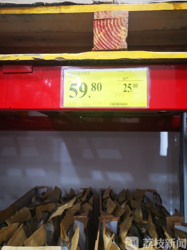 检查人员首先来到了山姆会员超市,一款新疆核桃果标注原价为84.8元一袋,促销价为59.8元一袋。在标识牌写明了促销期限为2019年12月12日到2020年2月9日。检查人员表示,按照规定,促销的期限必须在醒目位置公示。此外,这款产品如果标注有原价,那么就意味着这款商品必须有以原价售出的销售记录。在检查人员的要求下,商家提供了按原价的销售记录。