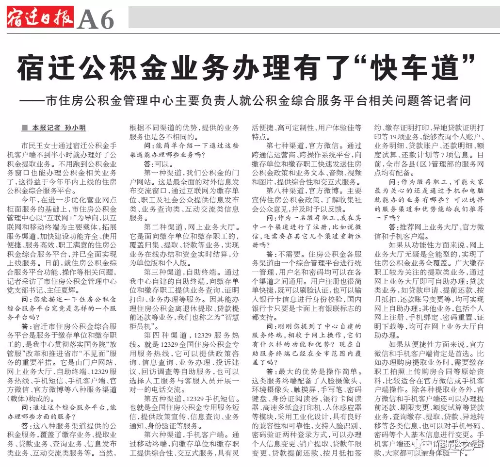 在进一步优化营业网点柜面服务的基础上,市住房公积金管理中心以“互联网+”为导向,以互联网和移动终端为主要载体,拓展服务渠道,加快建设功能齐全、使用便捷服务高效、职工满意的住房公积金综合服务平台,并已全面实现上线服务。日前,就住房公积金综合服务平台功能操作等相关问题,“宿迁日报”记者采访了市住房公积金管理中心党支部书记、主任夏辉。