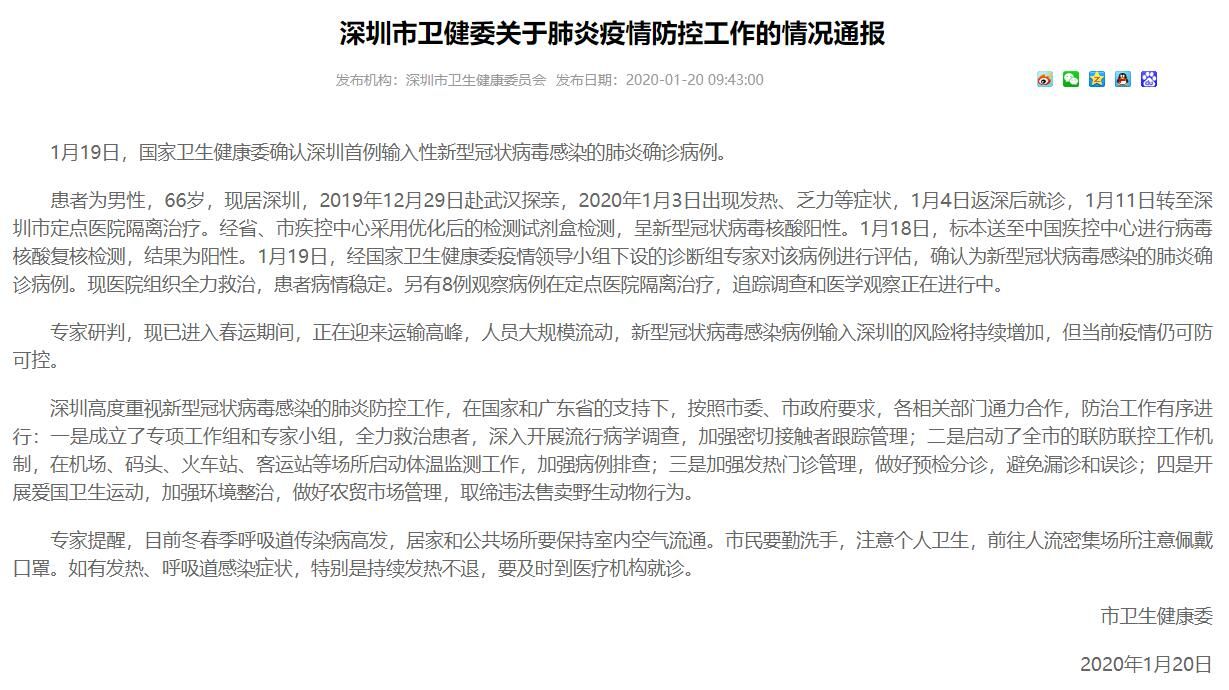 深圳市卫健委关于肺炎疫情防控工作的情况通报