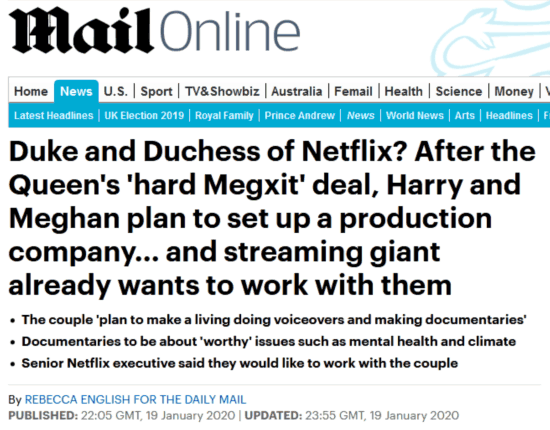 [环球网报道 记者 温家越]英国白金汉宫18日宣布哈里王子及其妻子梅根辞去王室公职后,据英国《每日邮报》19日报道,两人计划成立一家制作公司。美国流媒体巨头奈飞公司(Netflix)的一位高管已经表示,他们愿与这对夫妇进行合作。