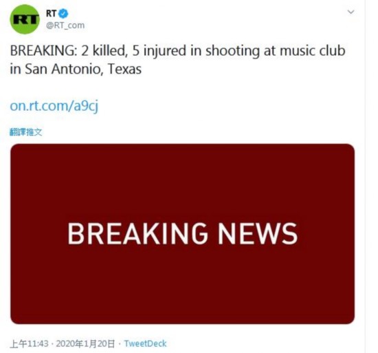 【环球网快讯】据俄罗斯RT电视台刚刚消息,美国得克萨斯州圣安东尼奥一音乐俱乐部发生枪击事件,已造成2人死亡,5人受伤。