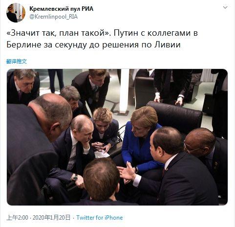 俄新社驻克宫记者组同时配文:“‘好吧,计划就这么定吧。’普京及其同事在柏林就利比亚问题作出决定的前一秒。”