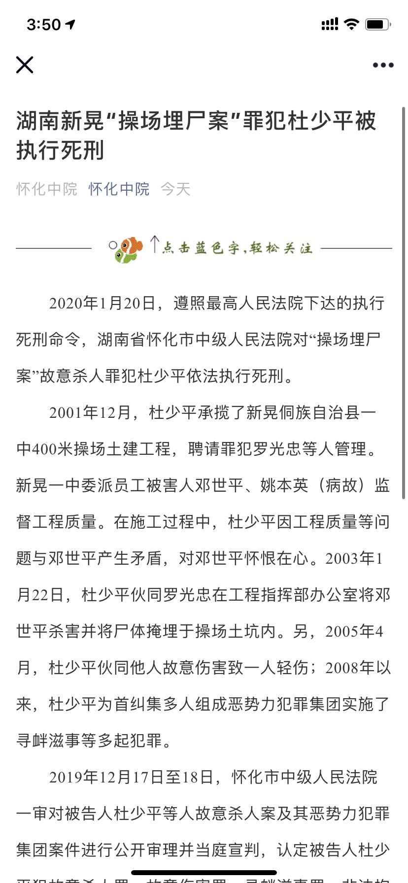荔枝新闻讯 据怀化中院消息,2020年1月20日,遵照最高人民法院下达的执行死刑命令,湖南省怀化市中级人民法院对“操场埋尸案”故意杀人罪犯杜少平依法执行死刑。