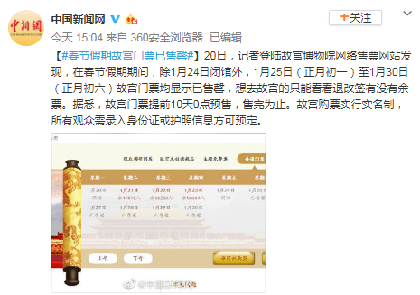 20日,记者登陆故宫博物院网络售票网站发现,在春节假期期间,除1月24日闭馆外,1月25日(正月初一)至1月30日(正月初六)故宫门票均显示已售罄。据悉,故宫门票提前10天0点预售,售完为止。故宫购票实行实名制,所有观众需录入身份证或护照信息方可预定。