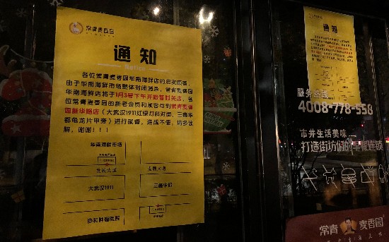 1月20日晚,记者探访发现,武汉华南海鲜市场附近的餐饮店已贴出闭店通知。