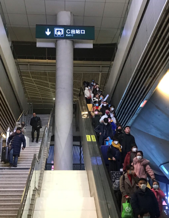 1月20日,武汉高铁站出站口,不少乘客带有口罩。