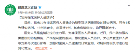 【武汉卫健委:15名医务人员感染新型冠状病毒 另有1名疑似病例】