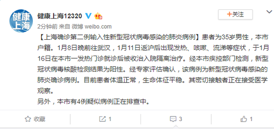 荔枝新闻讯 据上海市卫健委官方微博通报,上海确诊第二例输入性新型冠状病毒感染的肺炎病例。患者为35岁男性,本市户籍。1月8日晚前往武汉,1月11日返沪后出现发热、咳嗽、流涕等症状,于1月16日在本市一发热门诊就诊后被收治入院隔离治疗。经本市疾控部门检测,新型冠状病毒核酸检测结果为阳性。