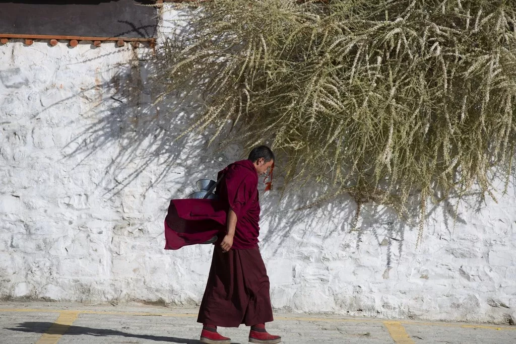 寺前终日香火缭绕,信徒们虔诚的叩拜在门前的青石地板上,留下了等身长头的深深印痕。万盏酥油灯长明,留下了岁月和朝圣者的痕迹。