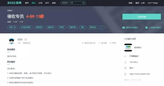 当前,新网银行在多家招聘网站上刊登广告大量招聘贷款催收员。从公开招聘的要求来看,工作内容即调查客户的还款能力,评估客户风险,要求催收员可以实施有效的处理手段,具备良好的心里素质,抗压及应变能力强等。